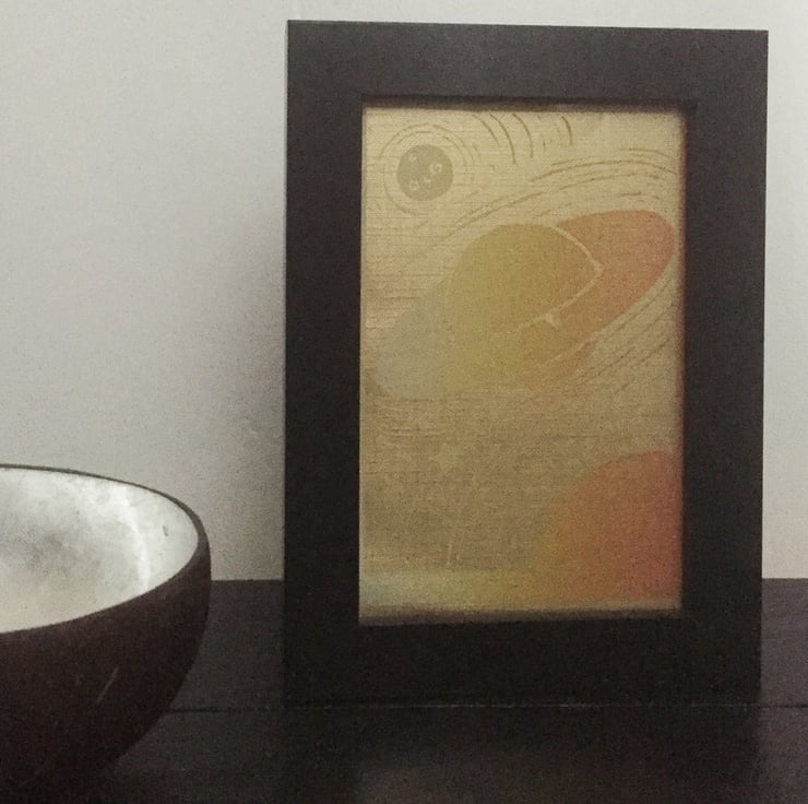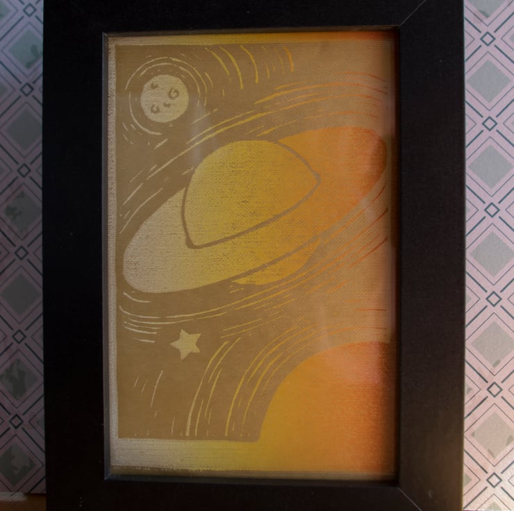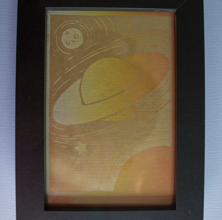 I wanted to create a print that would appeal to a child or adult and I think that planets are very appealing visually. I love merging colours to give depth to my work and think white into orange works very well. I also enjoy playing with textures in my work and I think that use of metallic textured paper in this image brings it to life.