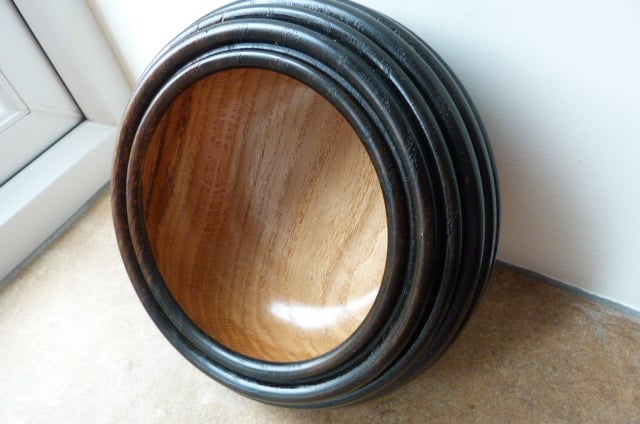 AN OAK BOWL WITH LATH TURNED RIB DECORATION TO THE OUTSIDE, THIS STAINED VERY DARK WITH AN OLD WOOD TURNERS SOLUTION, INSIDE LEFT NATURAL, OILED FINISH, 7-1/2'' IN DIAMETER, 3-1/4''HIGH.