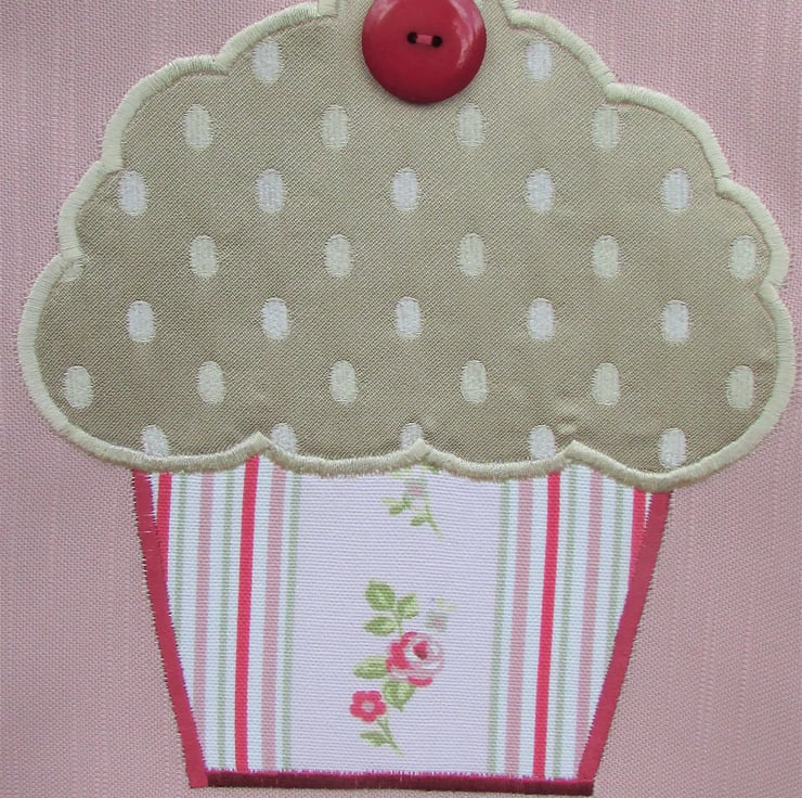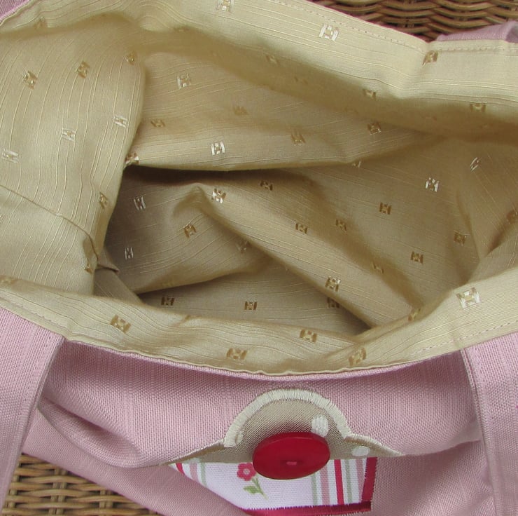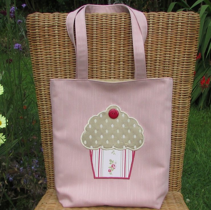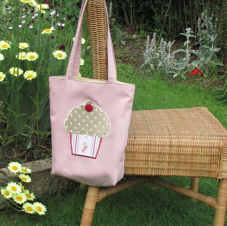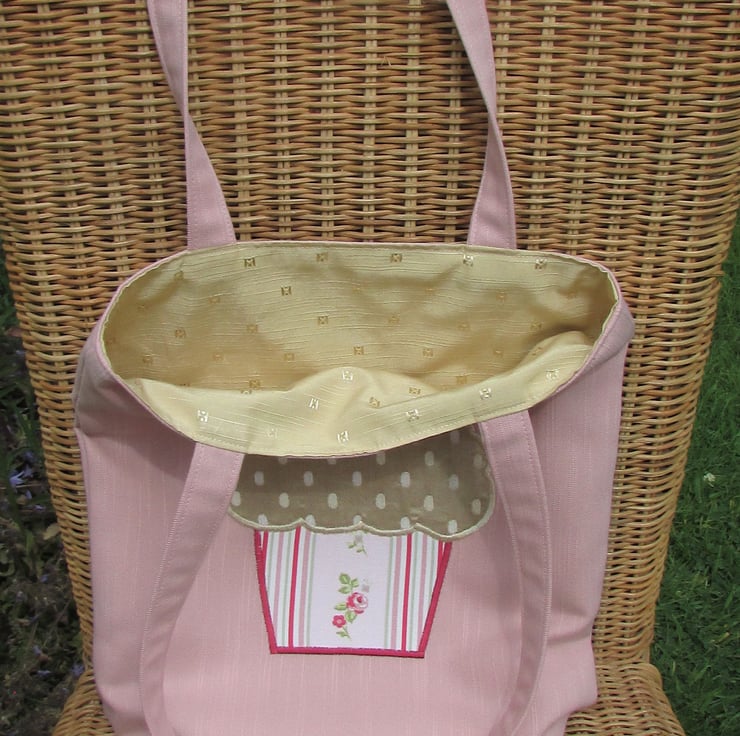 A pale pink tote bag with a cute applique cupcake. The cupcake is a lovely gold satin-finish fabric with a textured cream spot pattern. The cake case is a floral and stripe print fabric in pretty pastel shades of pink, green, red and white. The cake is embellished with a lovely red button cherry. The bag is lined with a lovely corn-coloured fabric featuring a pattern of tiny shiny squares.
