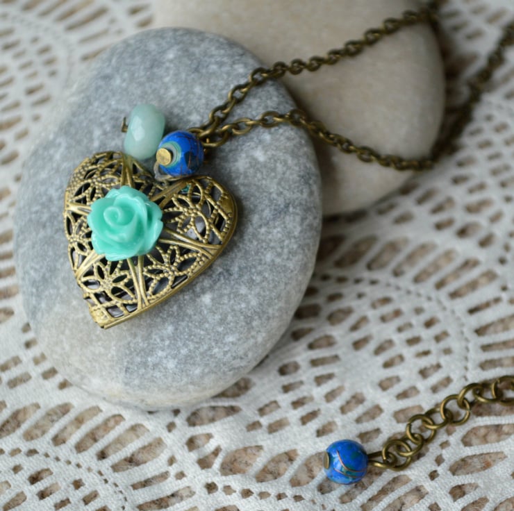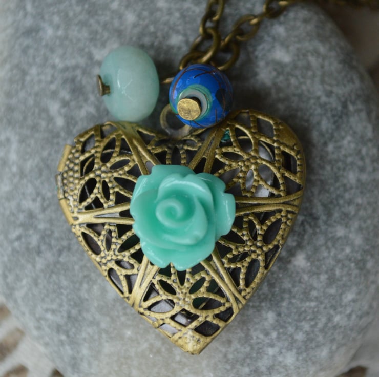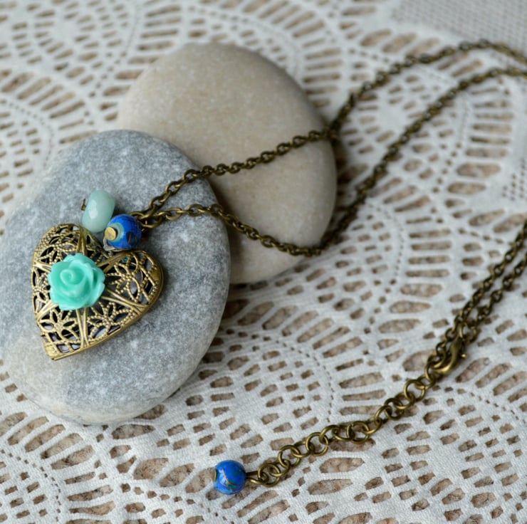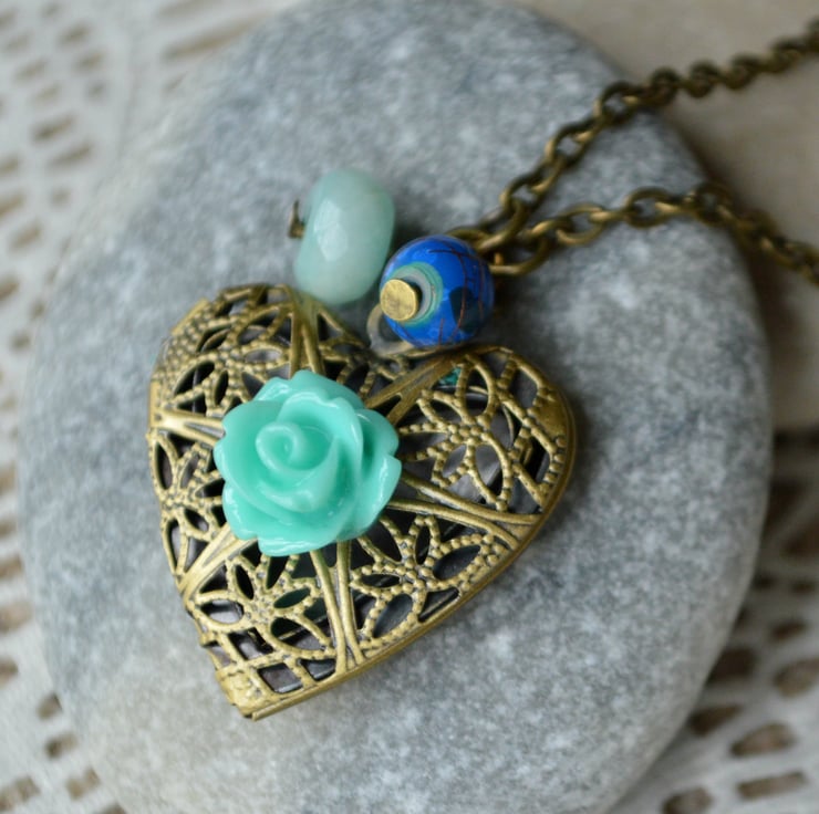 A lovely heart shaped, antique bronze locket with a turquoise blue rose cabochon, aquamarine and glass bead charms.