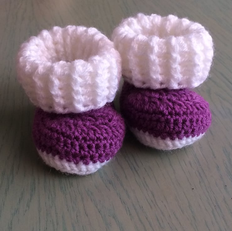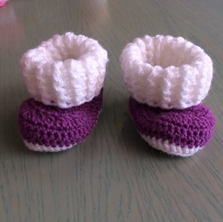 A cute pair of crocheted baby booties with fold over ribbed rim.