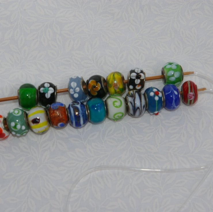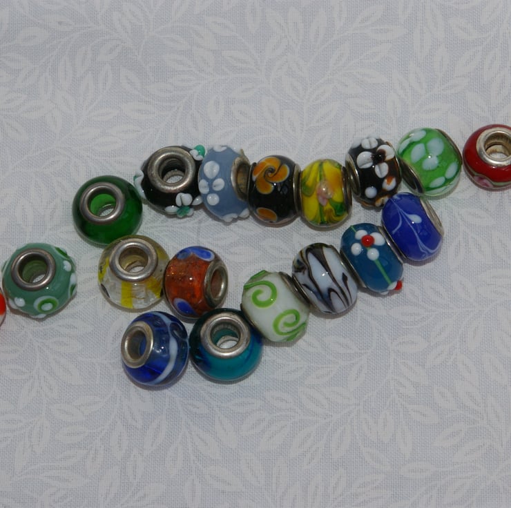 A bag of seventeen European lampwork mixed colour glass beads with large centre holes.