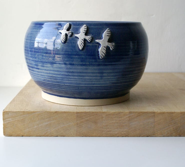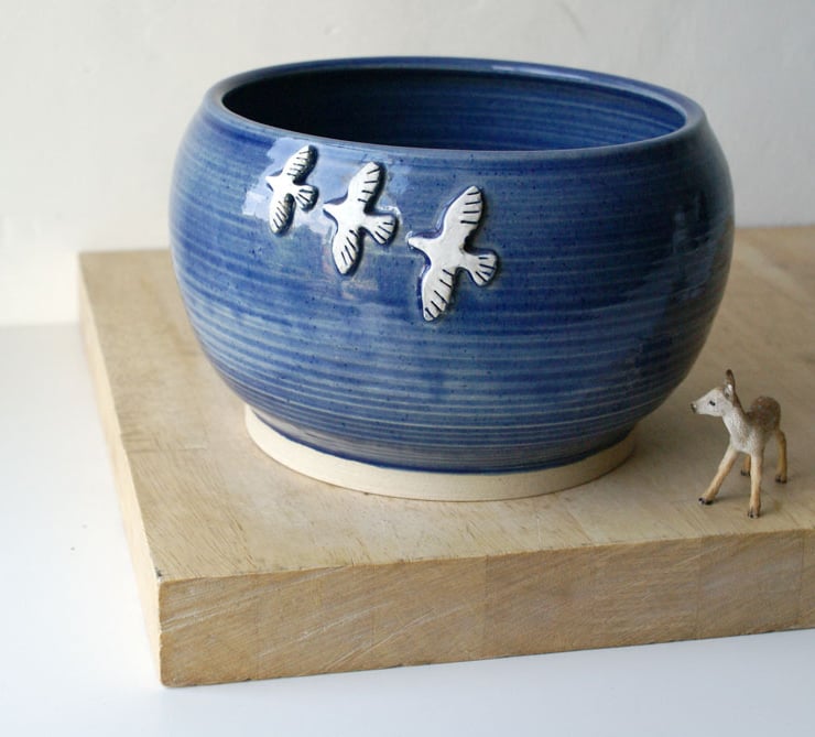 Stoneware pottery serving bowl glazed in in vanilla cream in ocean blue with birds in flight. Handmade Stoneware Pottery by littlewrenpottery on Folksy.