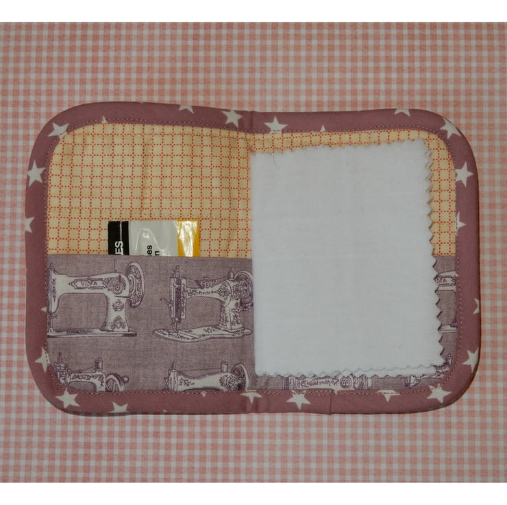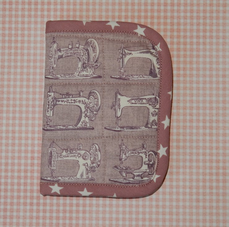 This dainty needle case measures approx 5.5 x4 inches and is made from fabric featuring vintage sewing machines. It is lined in a toning fabric and has four flannel leaves for your pins and needles. This needle case also has an inside pocket, made from the outer fabric for your pins or needles etc. (not included) It has a matching binding to complement this, and a layer of wadding for added body..An ideal present for the needlewoman, and would be a great present for anyone keen on sewing or for those essential repairs in any household.
