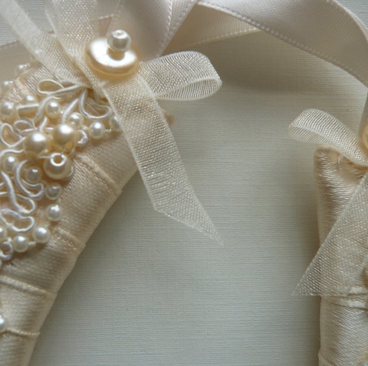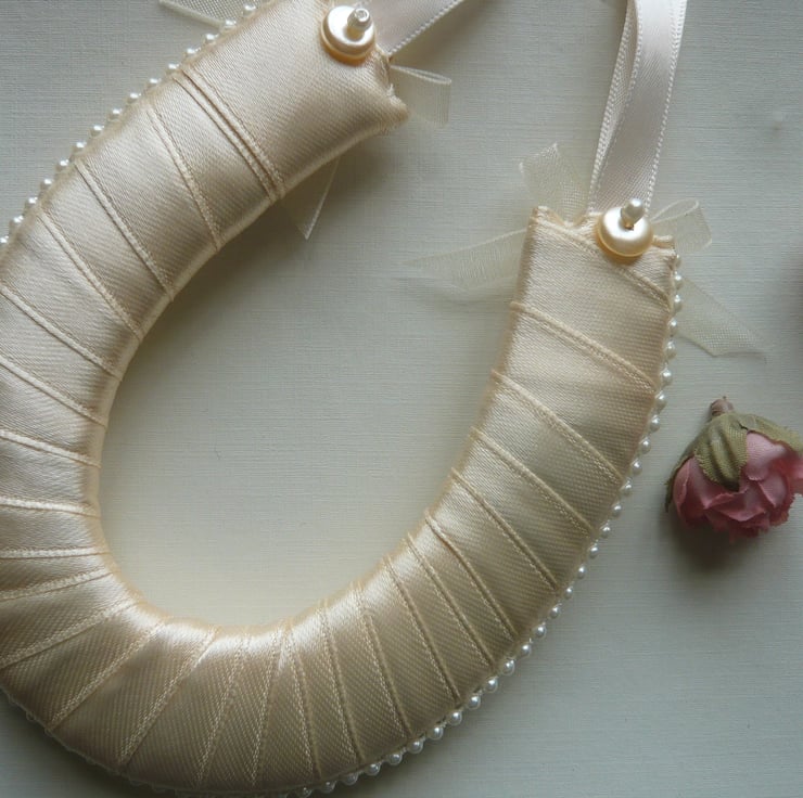 This small horseshoe measures approx. 9.5 x 11 cm . I have added small acrylic pearl beads to the lace to add a bit of depth and a bead trim around the edge.