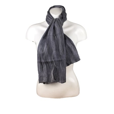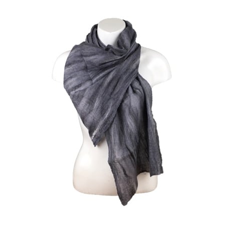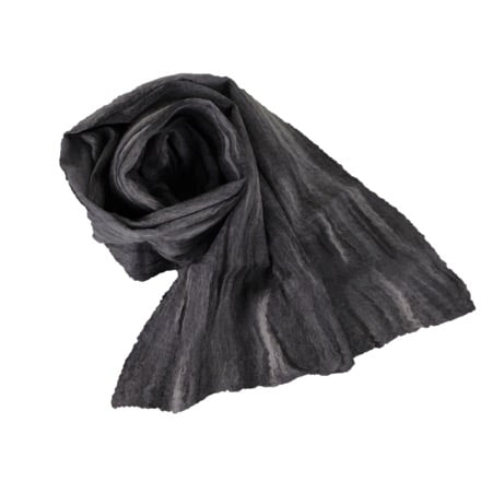 A blend of black, grey and white merino wool fibres have been nuno felted to both sides of a silk chiffon base fabric to create this gorgeous scarf. Nuno felting is a process that causes the fibres to migrate through the silk and bind with it. The presence of the silk chiffon allows the wool to be felted in an extremely fine layer and the resulting scarf is super soft, lightweight and floaty.