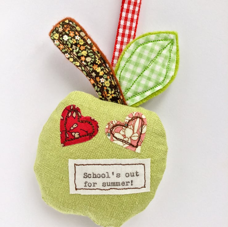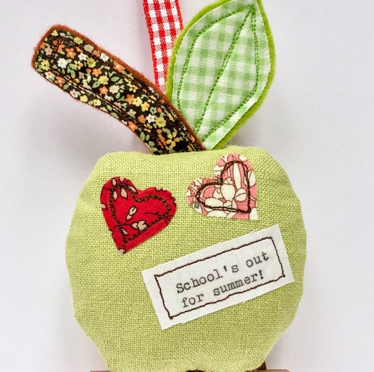 This lovely textile apple has been made using freemotion embroidery. Various fabrics have been appliqued for the stalk and leaf. Tiny Liberty print hearts and a cheeky song lyric curtesy of Alice Cooper! Stitched to make you smile.