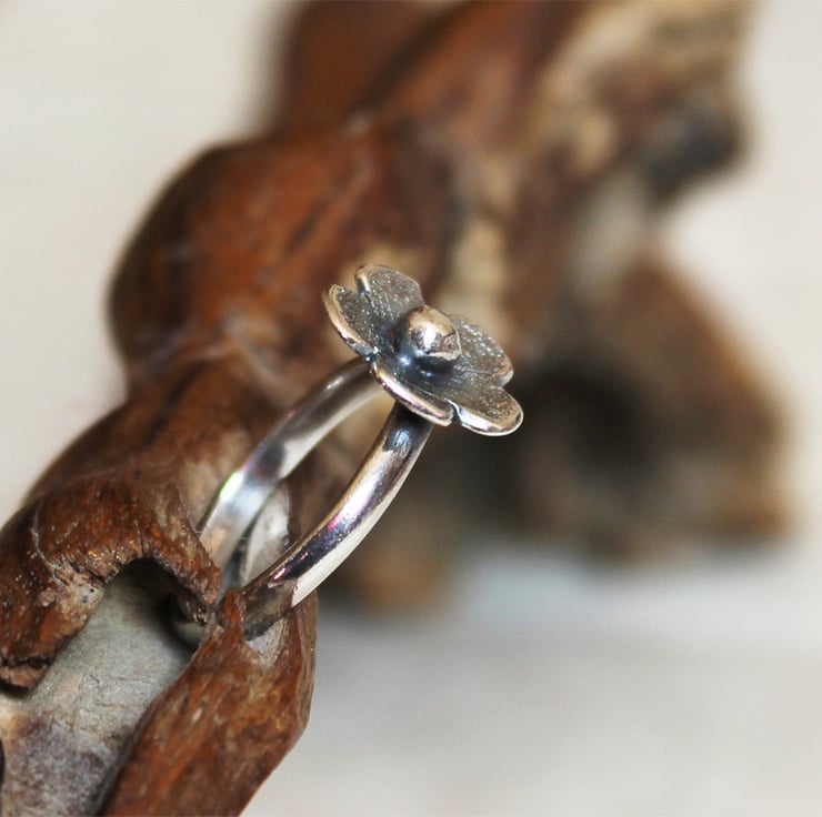 Consisting of a delicate looking flower in solid silver mounted upon a solitaire style D band ring. The petals of the flower have been reticulated and textured to contrast effectively with the polished orb at it's centre. The flower itself measures about 1.2mm across. The ring it sits upon is a pretty classic D ring of silver, it is 2mm thick.
