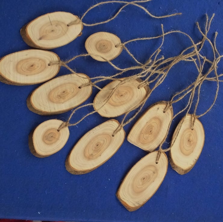 THIS SALE IS FOR A SET OF 10 NATURAL GIFT TAGS OR LABELS FOR CHRISTMAS, BIRTHDAY, WEDDING OR CHRISTENING PRESENTS MADE FROM THINLY SLICED SILVER BIRCH TREE BRANCHES THAT I HAD TO PRUNE THIS YEAR.