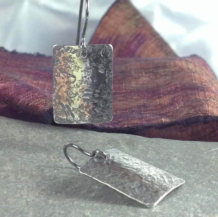 I have textured them with hammers and punches, then oxidised them to pick out the pattern. They are slightly curved, and hang from handmade hooks.