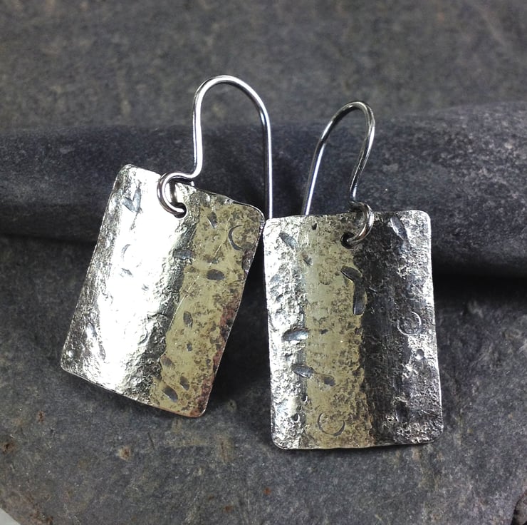 These sterling silver rectangular earrings remind me of time worn stone tablets with hints of ancient text .