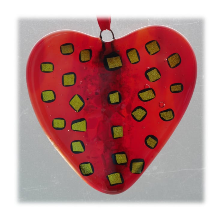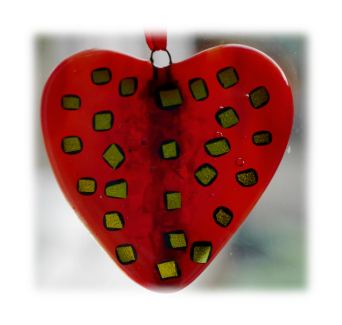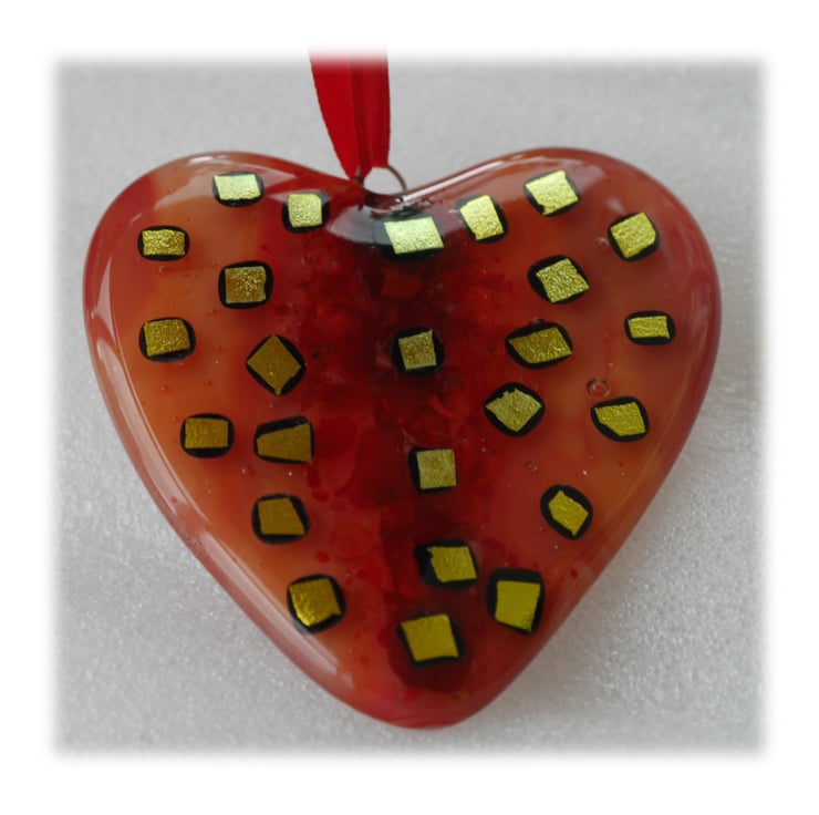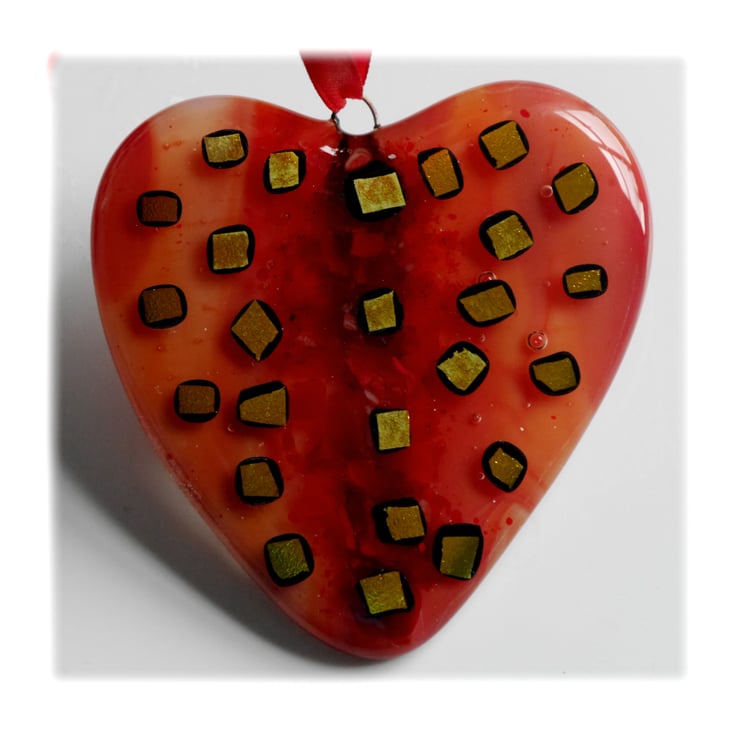 I've added lots of differently coloured red frit down the centre of the heart before very generously decorating with golden dichroic glass. Very pretty, sparkly and a classic design for a heart.