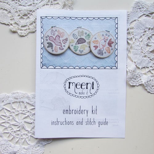 I love encouraging others to get crafting and so I have developed a range of "meeni make it" kits. The design for this embroidered squirrel and leaves is based on one of my woodland animal illustrations.