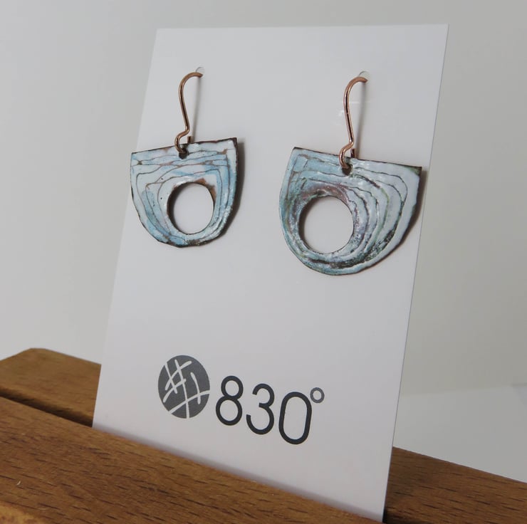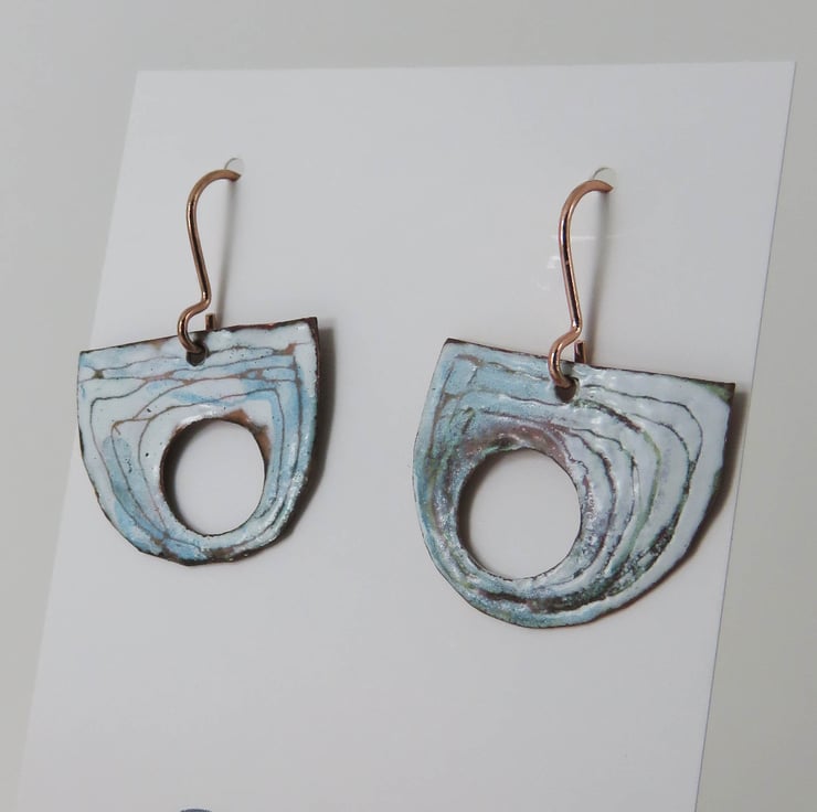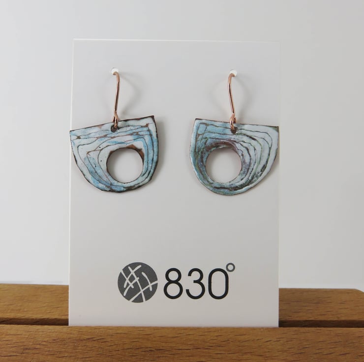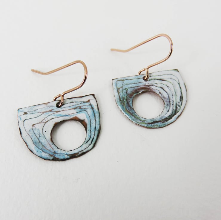 Free cut semi circle shapes with a hole punched in the middle. Enamel is applied onto the surface of the copper and then drawn into. The shapes are then hung on rose gold wires. Each set of earrings are unique and one off as the process doesn't allow exact reproductions.