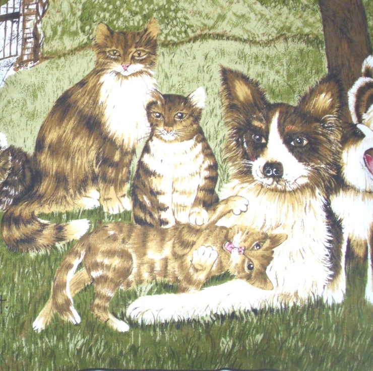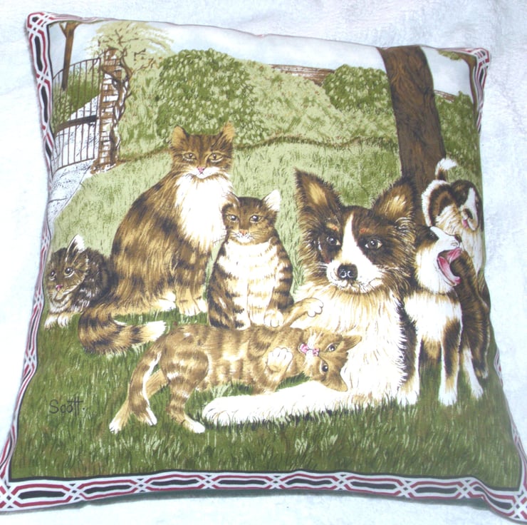 A square cushion, dogsand cats choral meeting in the garden with a cat and dog singing while the others sit with them. lovely and soft cushion ,would look good in any lounge, sitting room, study or office on any settee or armchair or in a conservatory or summer house or on a bed.