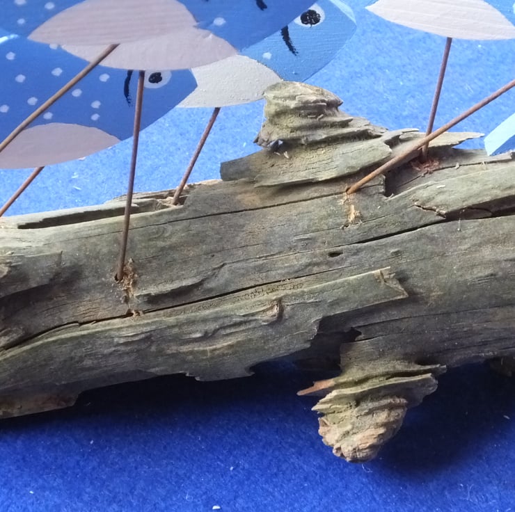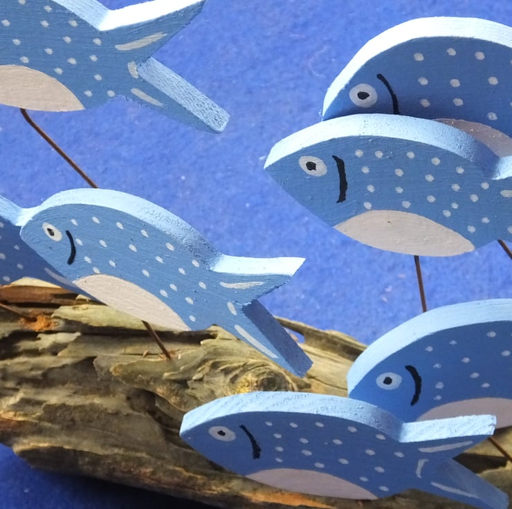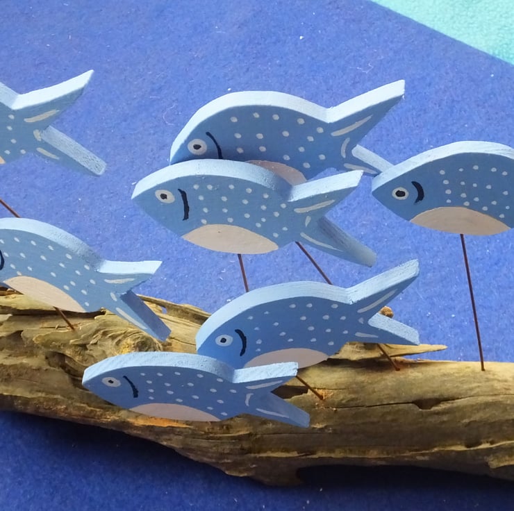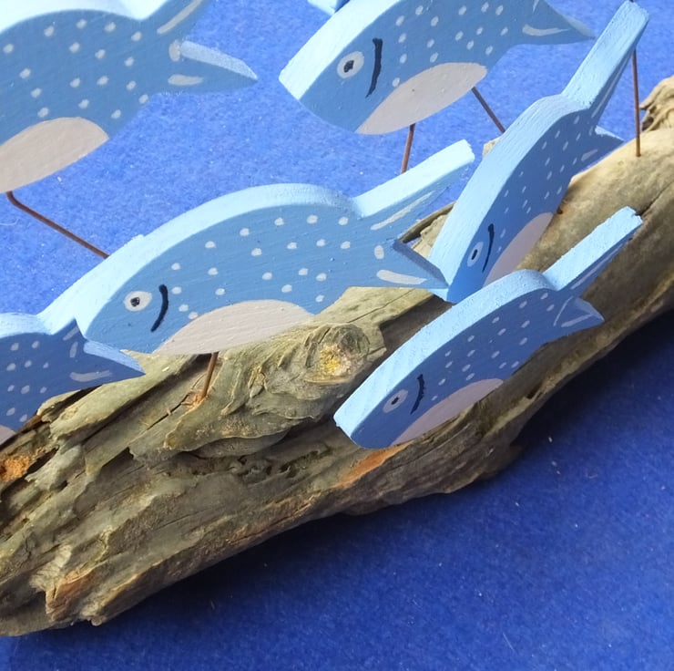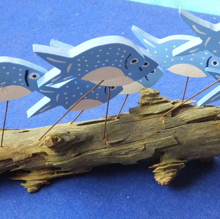 I AM SELLING ANOTHER HAND MADE AND HAND PAINTED SHOAL OF 5 BLUE & WHITE WOODEN FISH, ALL MOUNTED ON A PIECE OF CORNISH DRIFTWOOD.