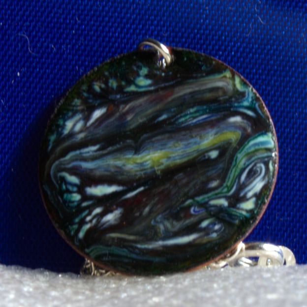 The pendant measures 15mm in diameter. It is mounted on a 45cm, silver plate, curb chain that fastens with a simple bolt ring.