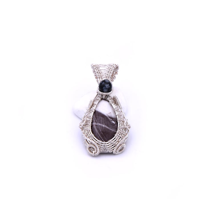 Stone and silver plated copper wire pendant with snowflake obsidian detail