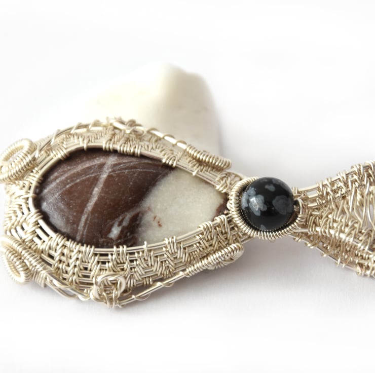 The stone is half brown half white and is hand wire wrapped using tarnish resistant silver plated copper wire. To add some detail i also incorporated a snowflake obsidian gem stone next to the bail.