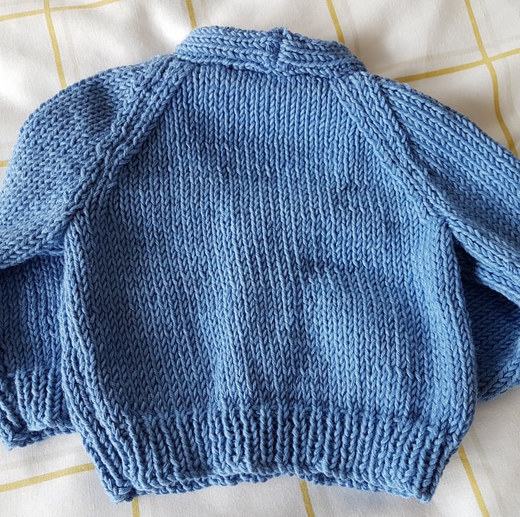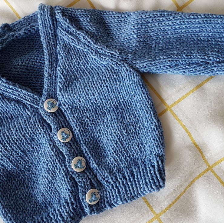 A simple but practical cardigan for a new born baby boy with raglan sleeves and a 'v' neck