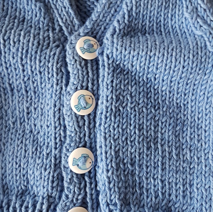 Hand knitted in cobalt blue cotton yarn with 4 cute fish buttons.