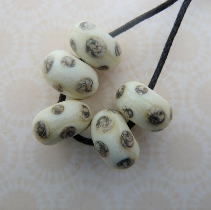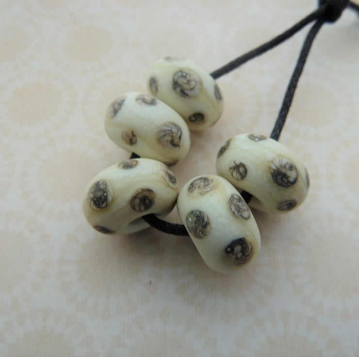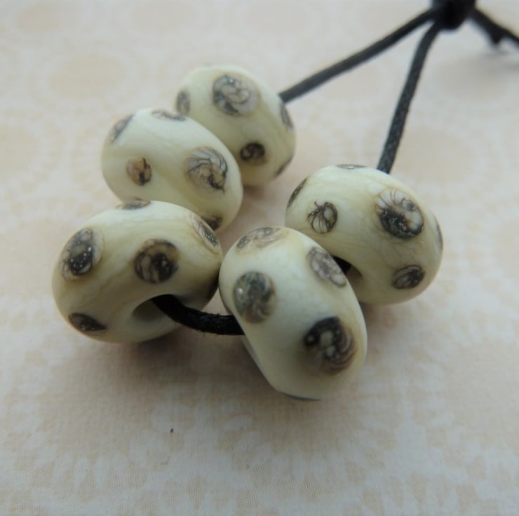 A set of 5 lampwork glass beads made with ivory glass and featuring ivory spots, they have been tumbled to give a smooth, matte effect.