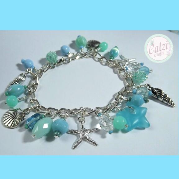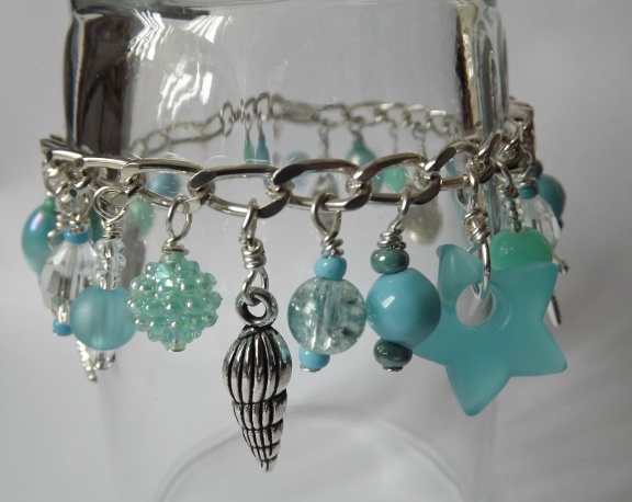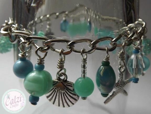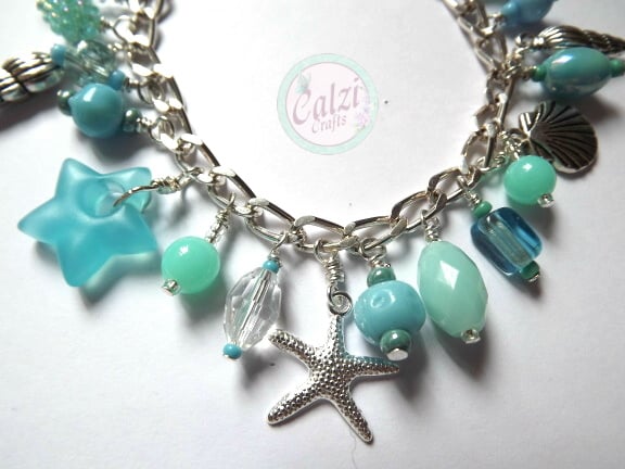 This seashell charm bracelet has been made in shades of minty sea green and mid blue with shell and starfish charms and a mix of acrylic, glass and ceramic beads, all on a chunky silver tone chain which fastens with a lobster clasp.
