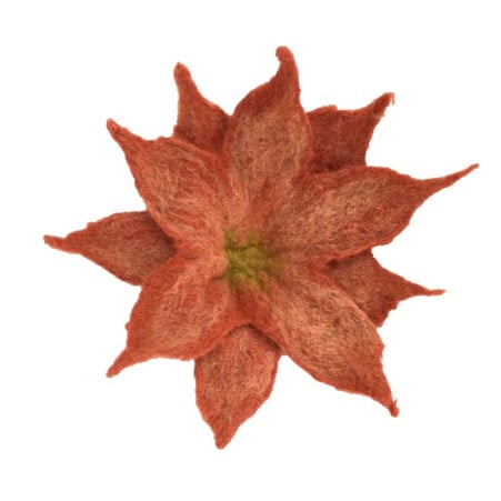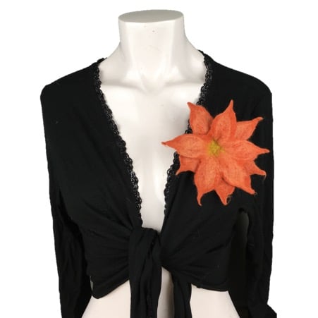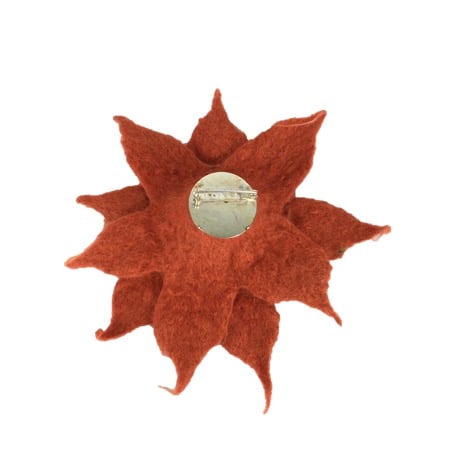 Wet felted using merino wool fibres in a terracotta colour with a paler shade added as "veins" on the petals, this lovely flower brooch, corsage or lapel pin could also be used to secure a scarf or brighten up a bag or hat. The flower consists of two layers, each layer having five petals. It has a pale green centre and a silver tone brooch pin has been securely stitched to the reverse. The flower measures approximately 15cm (6") in diameter.