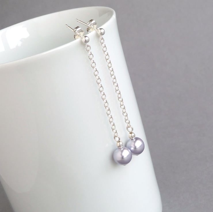 8mm lavender Swarovski pearls have been suspended from Sterling silver droppers to create these long, lavender pearl earrings. Whether you decide to wear your hair up or down, these drop earrings are long enough to peek out and add a pop of colour to your outfit. These lilac earrings would make great bridesmaids gifts.