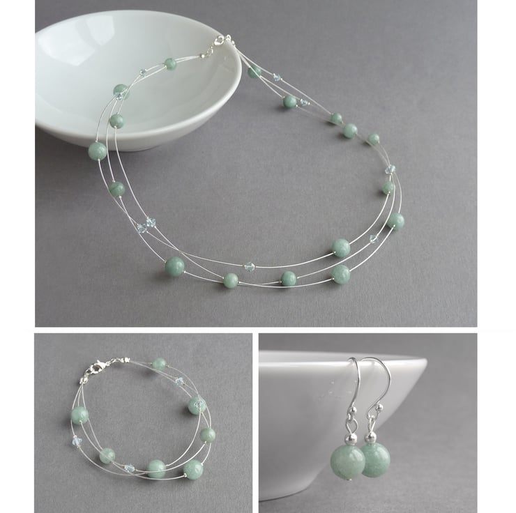 Created using jade and sparkling crystals, this dusty green, floating pearl jewellery set would make the ideal gift for bridesmaids. Each sage green set includes 1 necklace, 1 bracelet and 1 pair of drop earrings and will arrive gift wrapped in its own little box.
