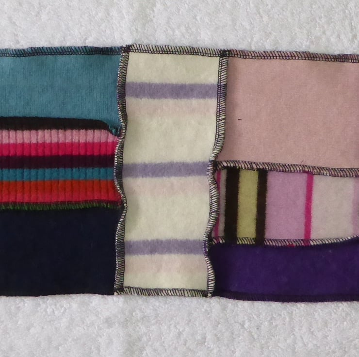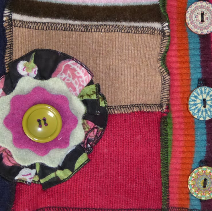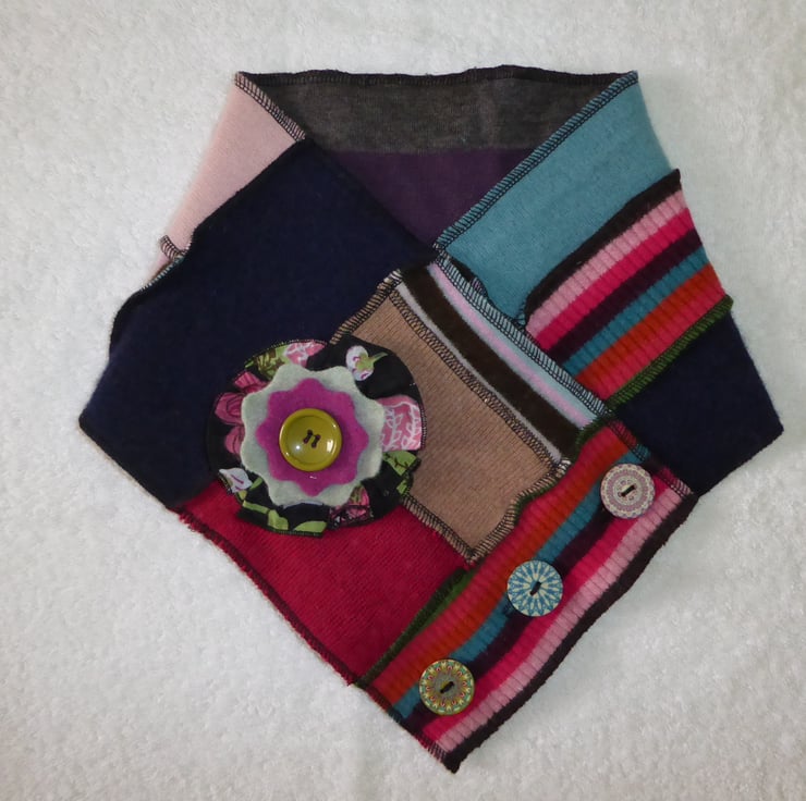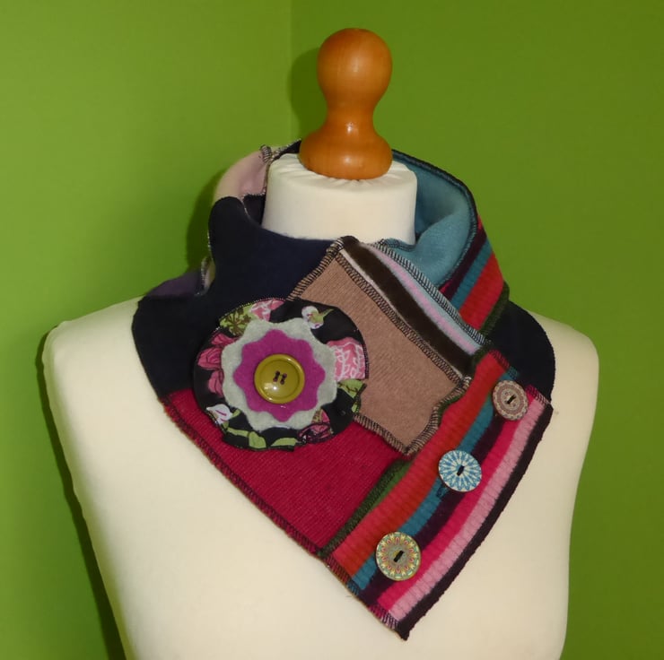 I have designed and created this fantastic cowl to keep you warm and snug. It is made from previously loved and recycled jumpers, that I have washed in a hot temperature and pre-shrunk. I have then cut and re-stitched the jumpers, into a patchwork strip with all seams being professionally finished with a serger/over-locker. Interfacing has been applied behind the buttonholes for stability, before a backing has been stitched in place. 3 mismatched wooden buttons have been sewn on to fasten this cowl. A decorative felt flower with button center has been pinned to the cowl with a safety locking clasp, so is removable.