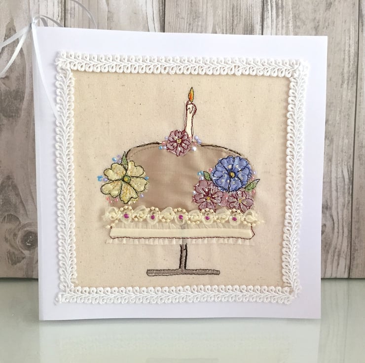 Birthday cake birthday card - made from coffee silk and lemon, blue or pink flowers. It's a mini-textile artwork in its own right and a wonderful keepsake that can be enjoyed (calorie free!) for many years.