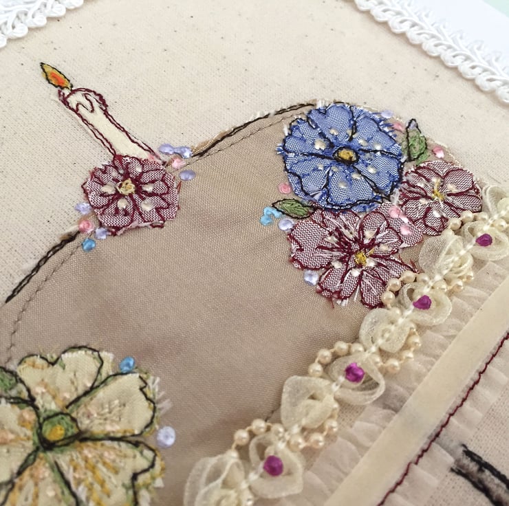Edged with gorgeous trimmings and further embellished with complementary pearlised and glitter inks and a ribbon.