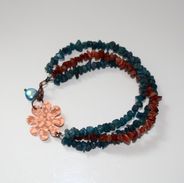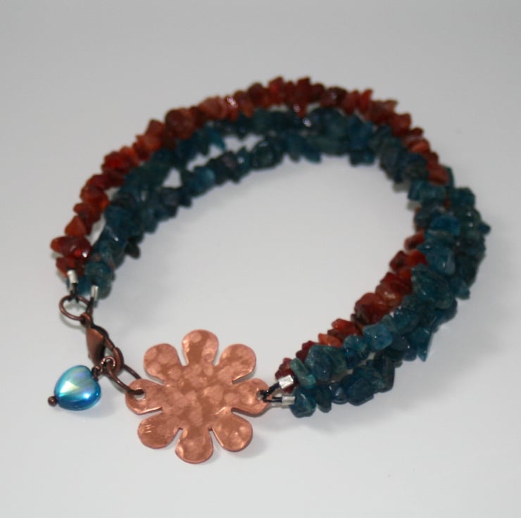 This bracelet is made using chips of beautiful blue-green neon apatite and orange carnelian. The focal is a hand-textured copper flower complemented with a shimmering blue glass heart.