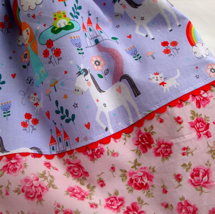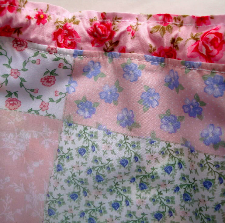 Handmade in 2 lovely printed cotton fabrics . Front has been embellished with a pretty red ric rac trim .