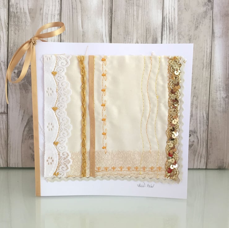 Luxurious wedding anniversary card to celebrate 50 golden years. The anniversary card is made with textiles and trimmings that are stitched together with free motion machine embroidery and then mounted onto quality white card stock.
