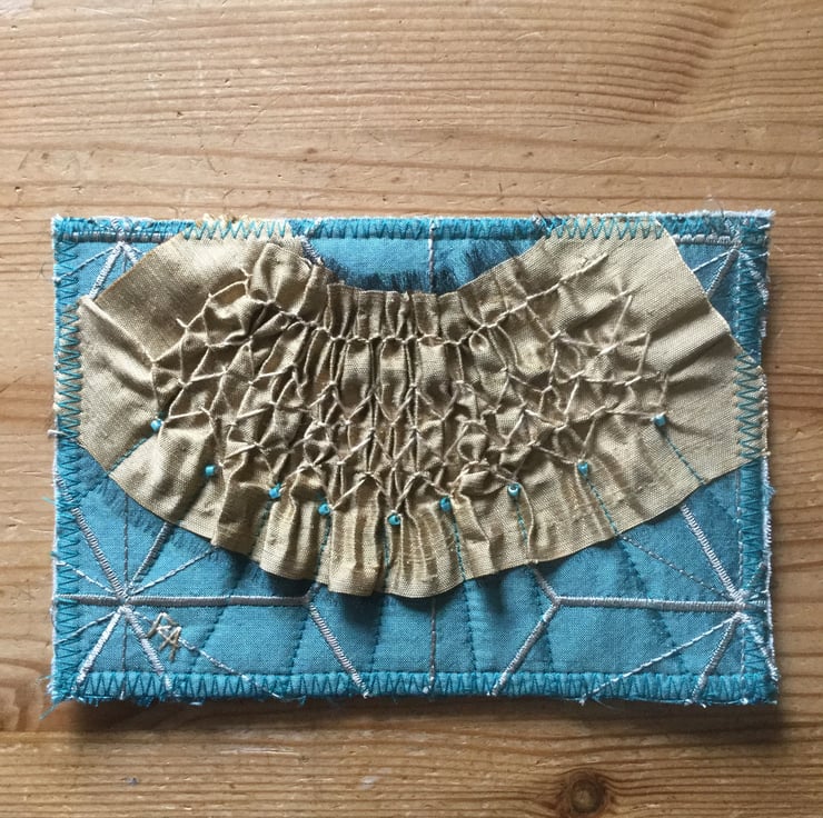 The backing of turquoise silk is decorated with a pleated strip of gold coloured silk that has been hand smocked in gold thread and then applied to the backing together with extra machine stitching and toning beads.