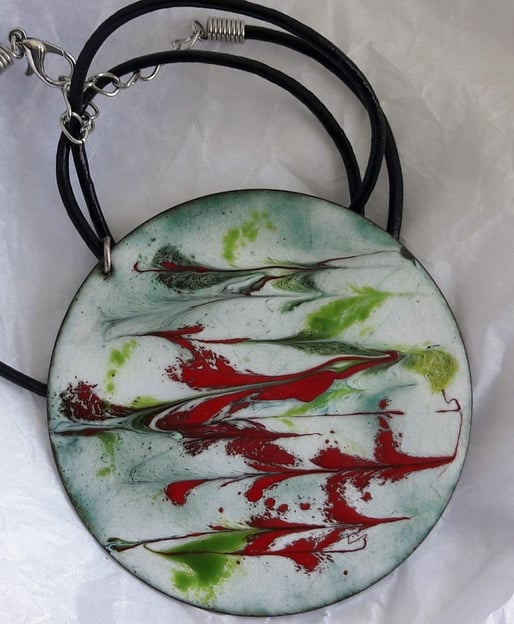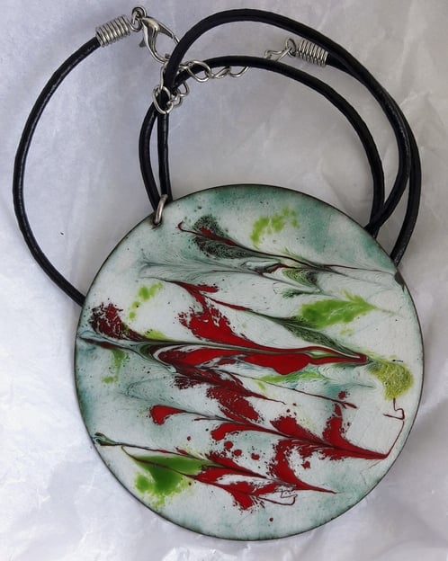 I have made the pendant by laying white enamel over the copper shape and then scrolling a random design through pools of red and green enamel while the piece was red hot in the kiln.