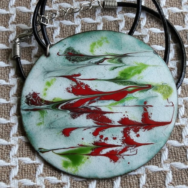 I have made the pendant by laying white enamel over the copper shape and then scrolling a random design through pools of red and green enamel while the piece was red hot in the kiln.