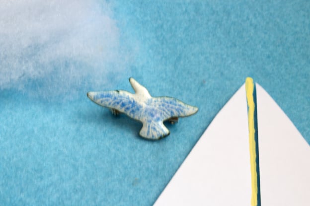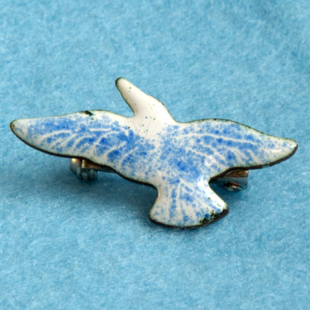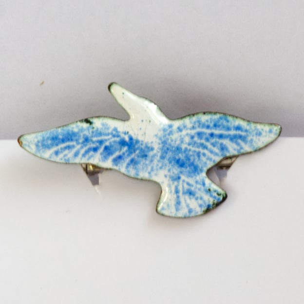 Over layers of white enamel, a layer of pale blue defines the bird's wings and tail.