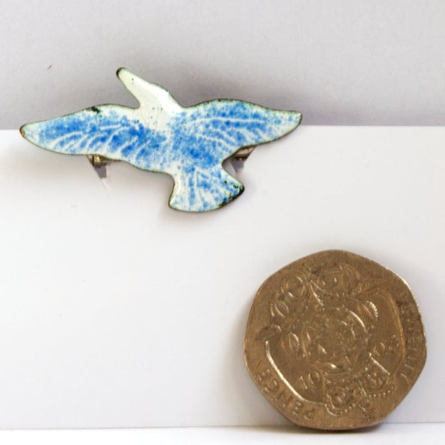 The seagull measures 32mm wingtip tp wingtip, 17mm beak to tail. it is mounted on a 20mm brooch bar soldered to the copper base. The pin secures with a rotating catch.
