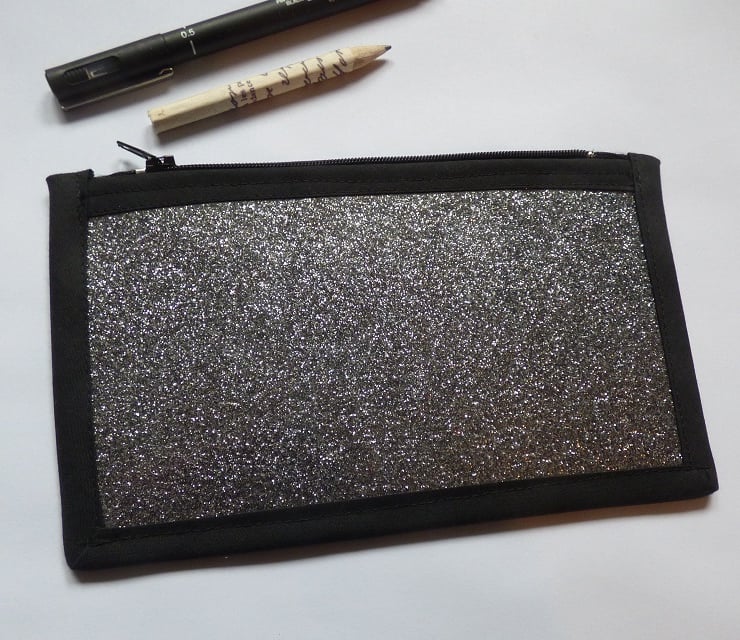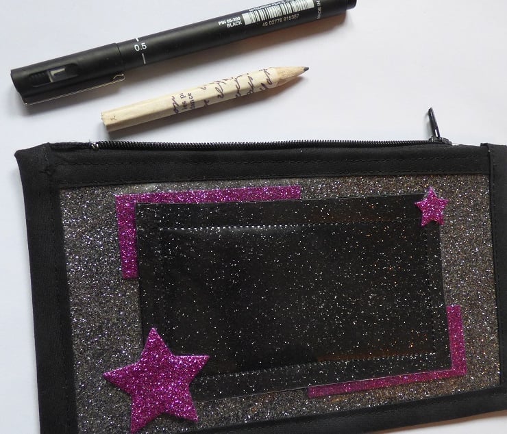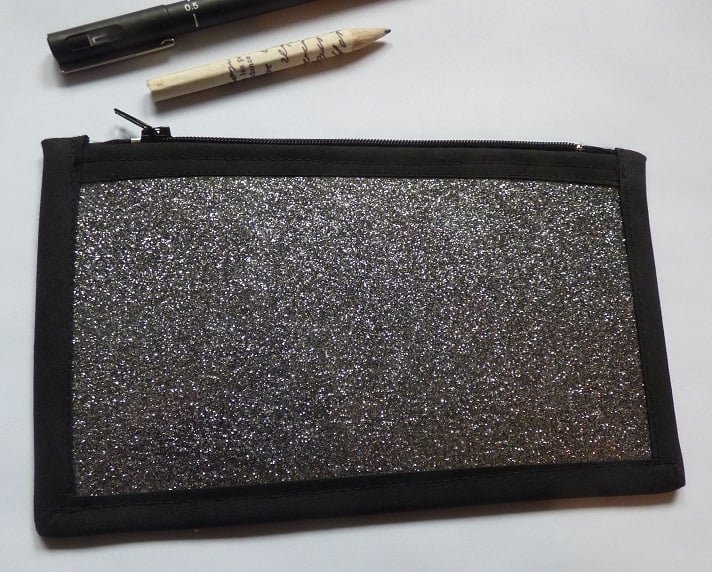 I have used glitter felt in a modern mix of silver, black and pink colours to create this bag, it measures 10cmx18cm, has a 6" black zip. I have covered the main body of the pouch with clear pvc making it easy to sponge clean.