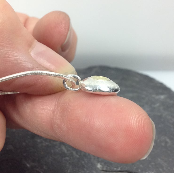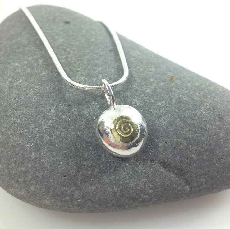Solid thick sterling silver pebble with gold detail stamped with a spiral. The pendant is roughly a round shape , it has a beaten texture and has been polished to a subtle shine.