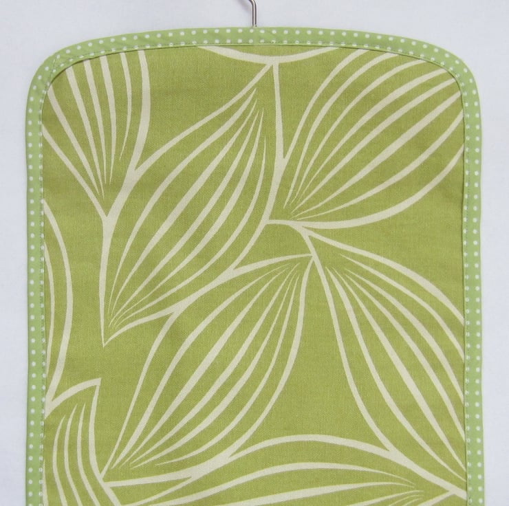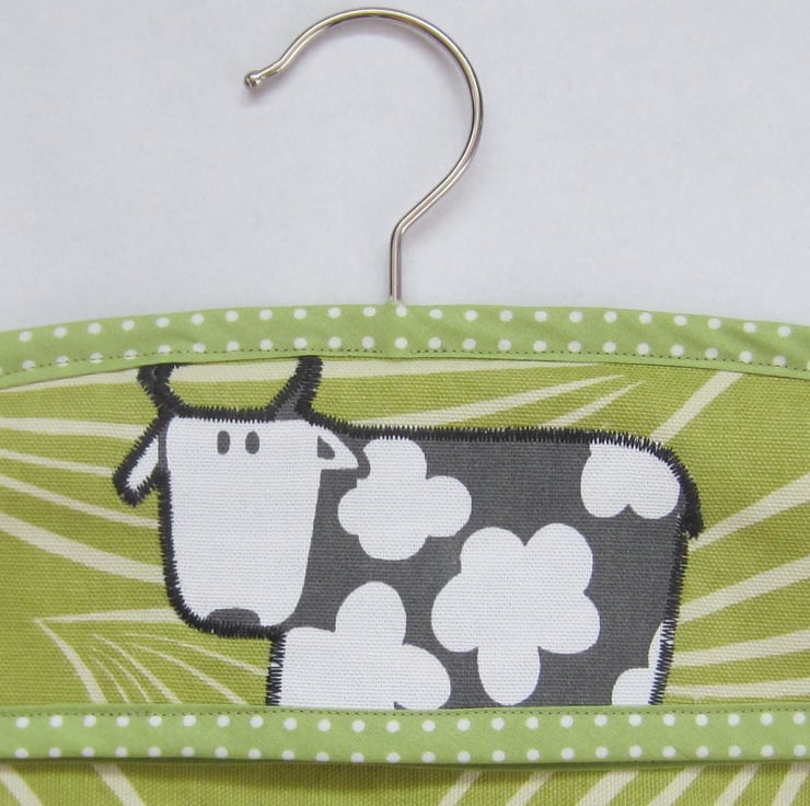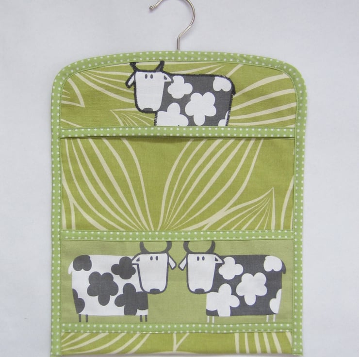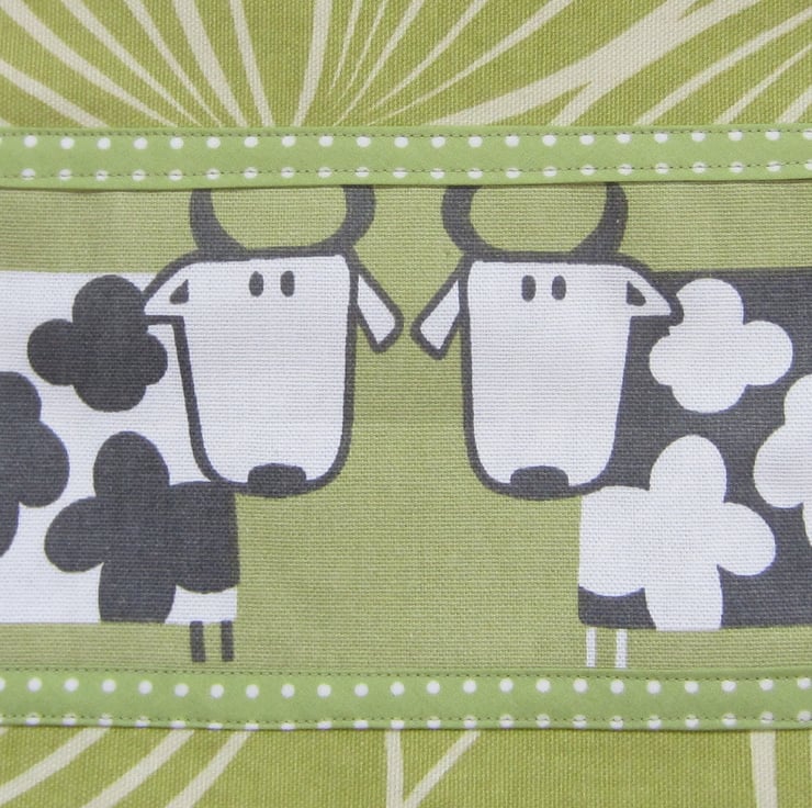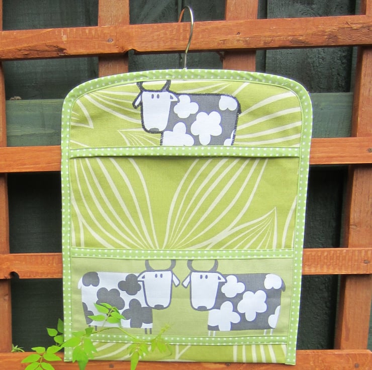 Sturdy green and cream large leaf patterned peg bag with added black and white cow panel and applique. It is edged with lime green and white spotty bias binding and is fully lined with a cream fabric.