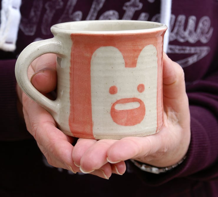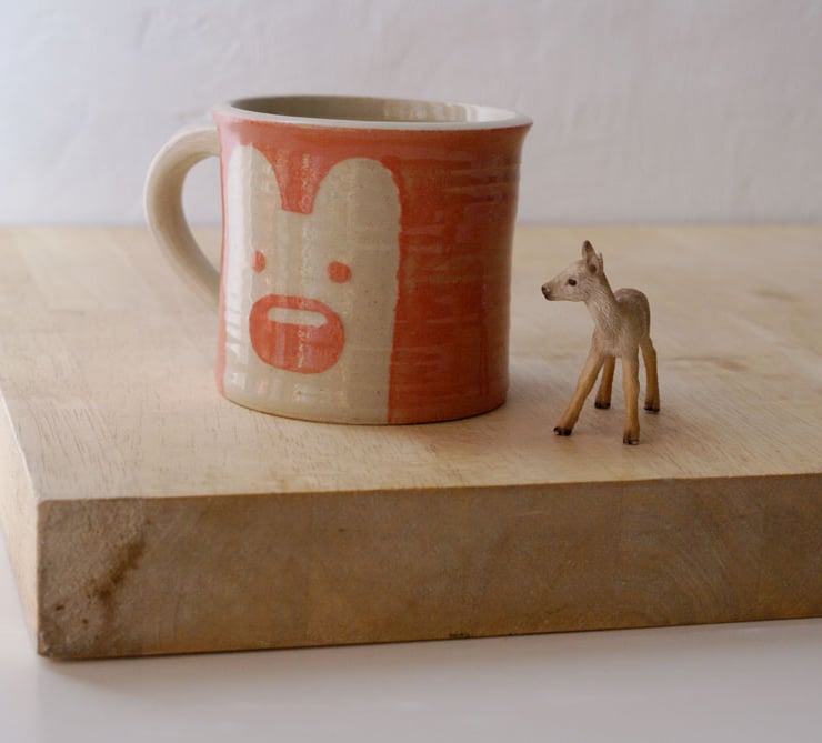 The mug is decorated with a bear motif which was painted on with pink coloured slip by hand, it was then glazed over with simply clay which has a gloss finish. The Little Wren Pottery stamp is printed on the bottom of the mug marking it out as unique handmade item.