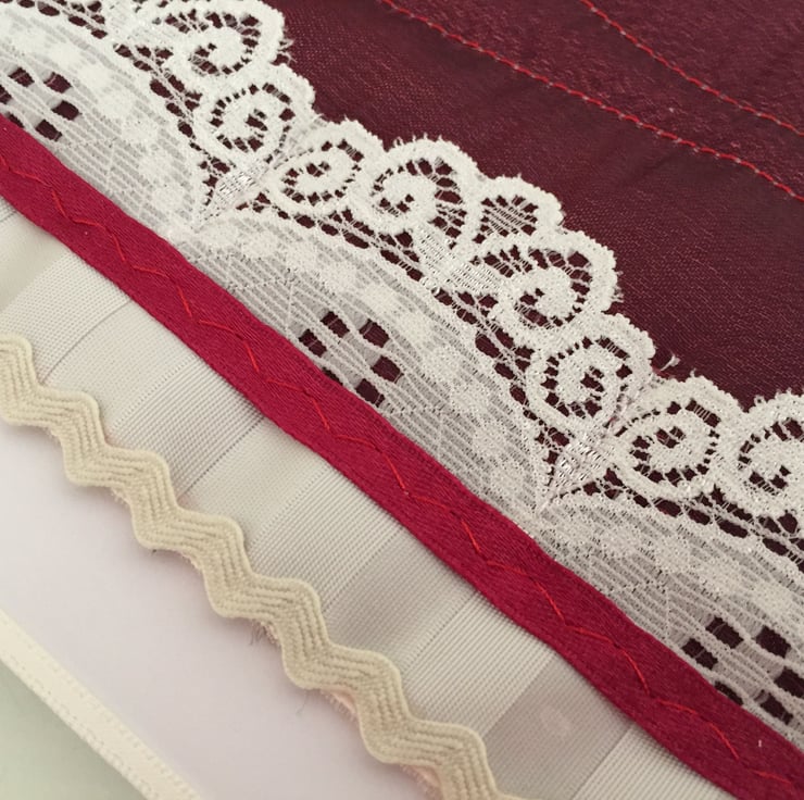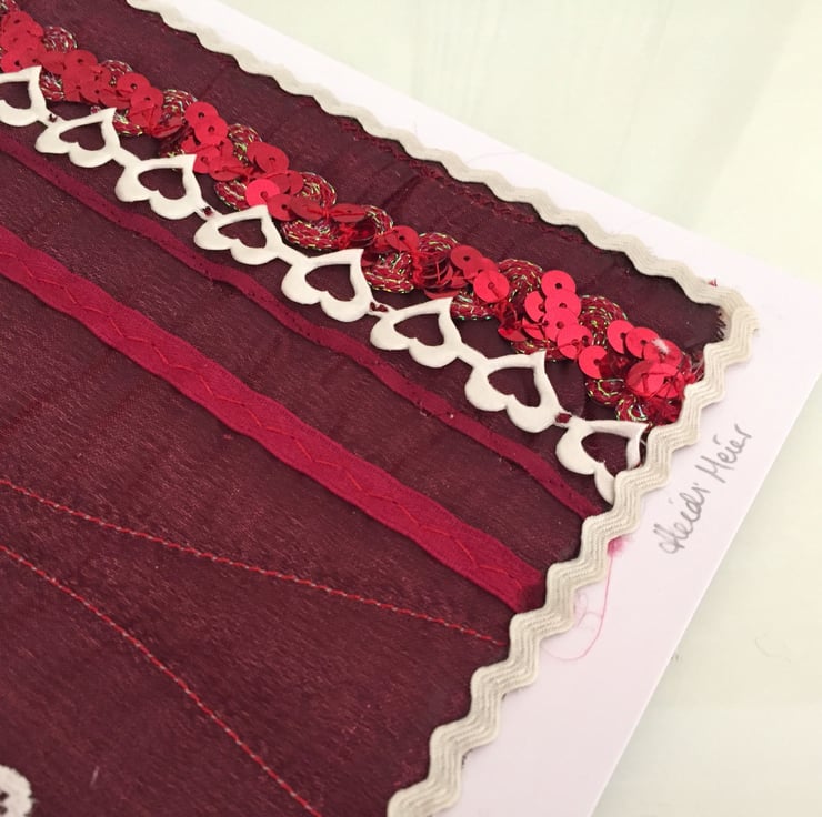 This ruby wedding anniversary card is made from a variety of textiles and trimmings
