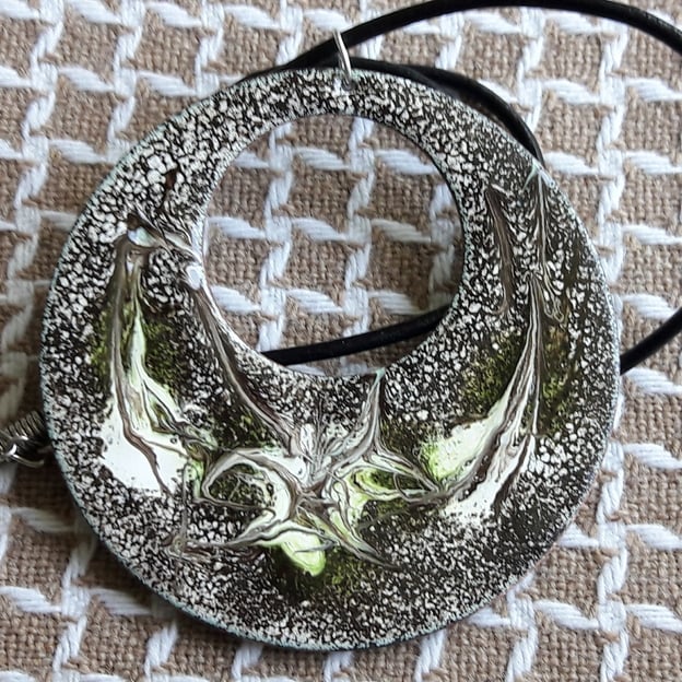 I have made the pendant by laying white enamel and then brown enamel over the copper shape then scrolling a random design through pools of white and gold enamel while the piece was red hot in the kiln.