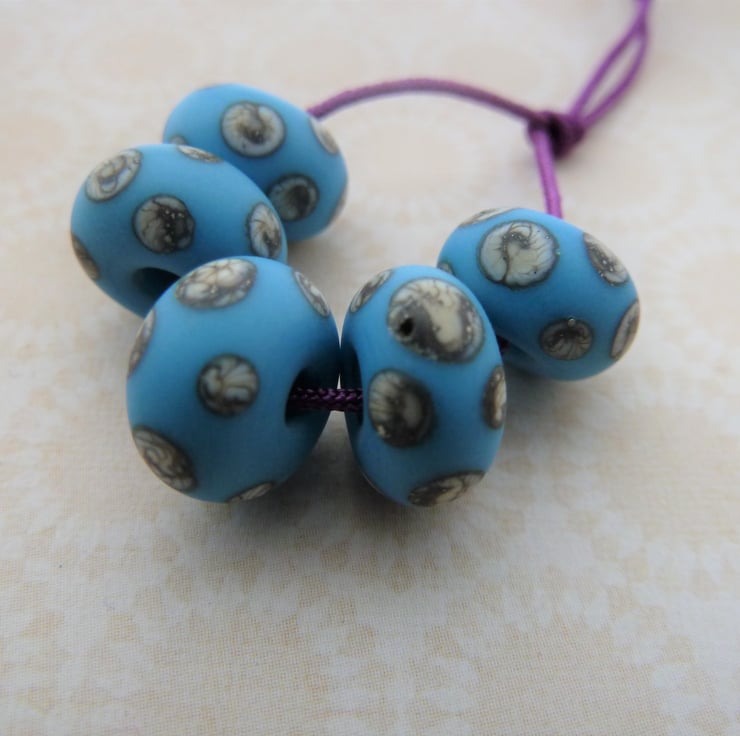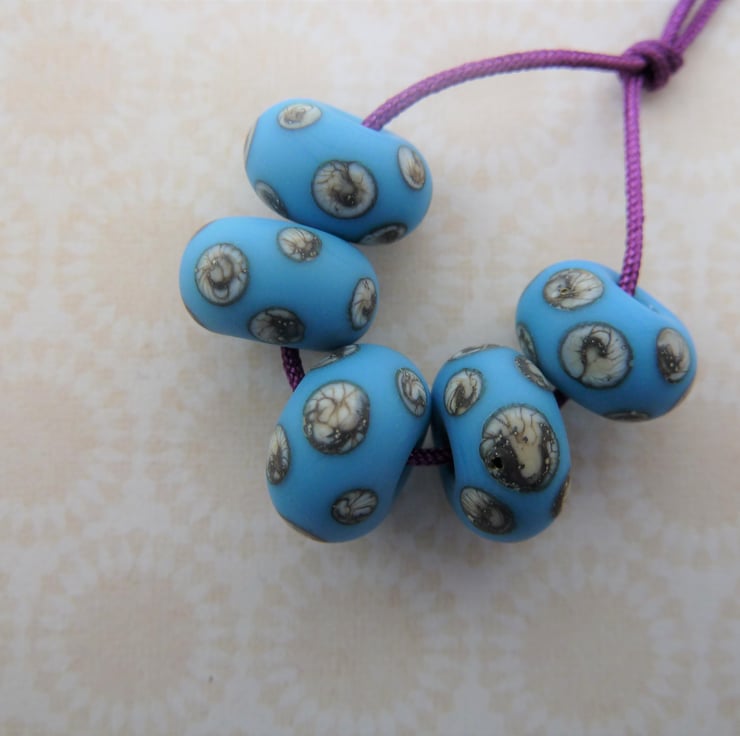 A set of 5 lampwork glass beads made with blue glass and featuring ivory spots, they have been tumbled to give a smooth matte effect.