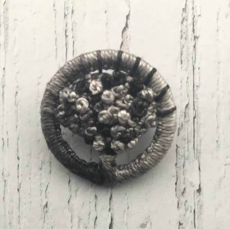 I have made this Dorset button on a 32mm brass ring using a cotton Perle shade changing thread in shades of grey from a dark almost black charcoal to a light silvery grey. It has been embroidered with french knots for a 3D effect resembling a bouquet of flowers or a tree laden with fruit or blossoms.