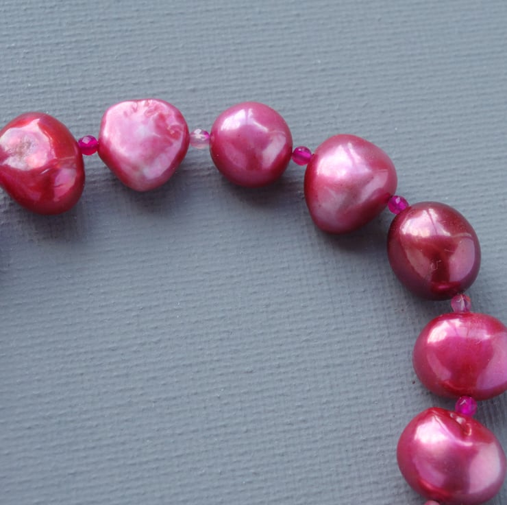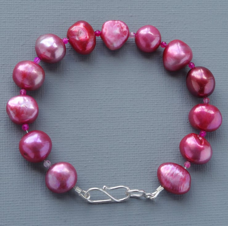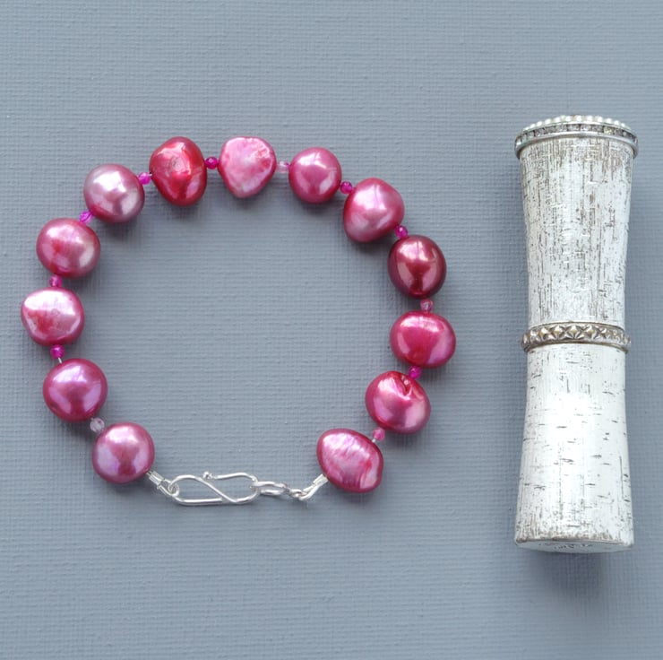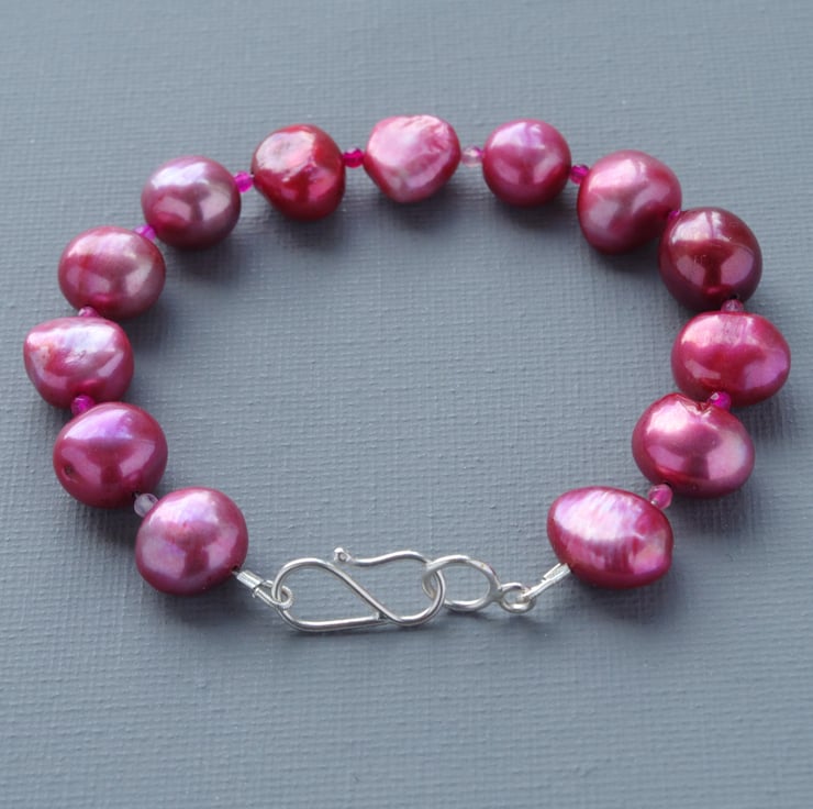 These beautiful dyed freshwater cultured pearls come in an assortment of shades from silvery plum, raspberry and dark cherry red creating a melange effect in this bohemian beach style bracelet. I have alternated them with sparkling faceted red banded agate which ranges from pale pink to bright red and is the perfect complement to the large freshwater pearls. Finished with my own design of hand-forged hook clasp this bracelet looks wonderful stacked up with other beaded bracelets for a stylish beach look. It can also be fastened easily without any assistance. My bracelets all have an internal diameter of 175 mm or 7" which will fit most wrists without slipping over the hand and are packaged in a gift box with bow.